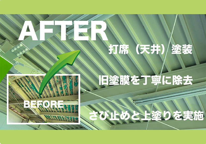 現場では、打席部分(天井)の旧塗膜がかなり劣化し、無数にと剥がれている状態でした。